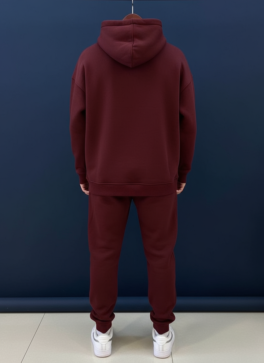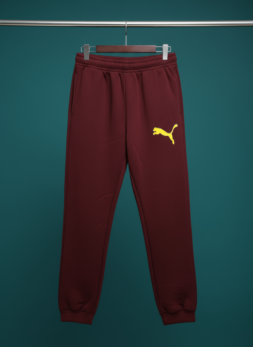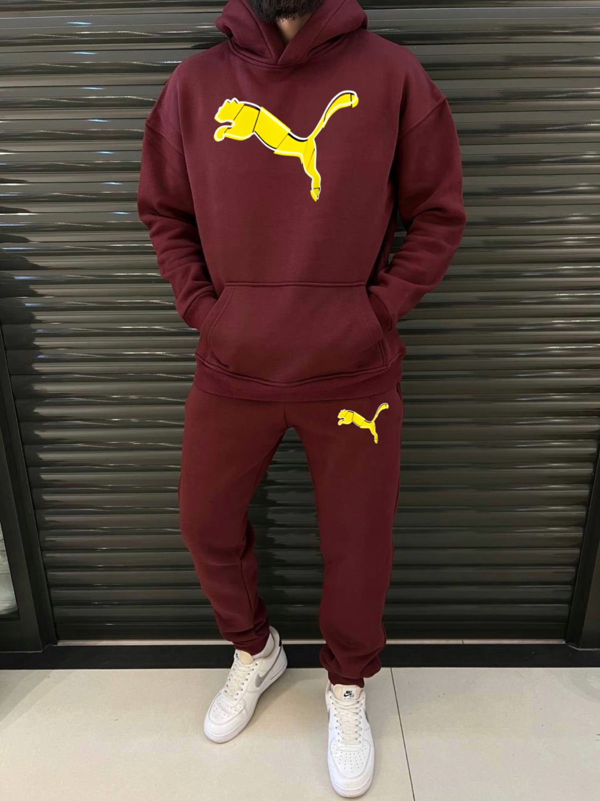 Premium PUMA Maroon Hoodie & Trackpant Set – Bold Yellow Logo, Cozy Fleece